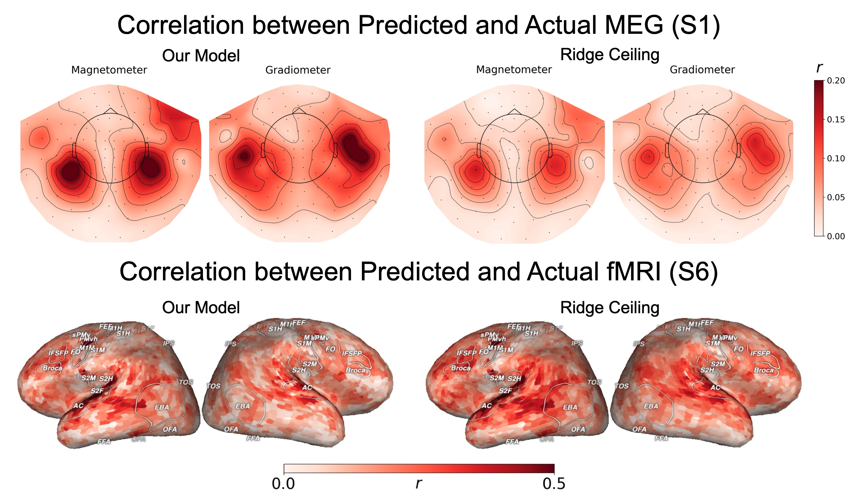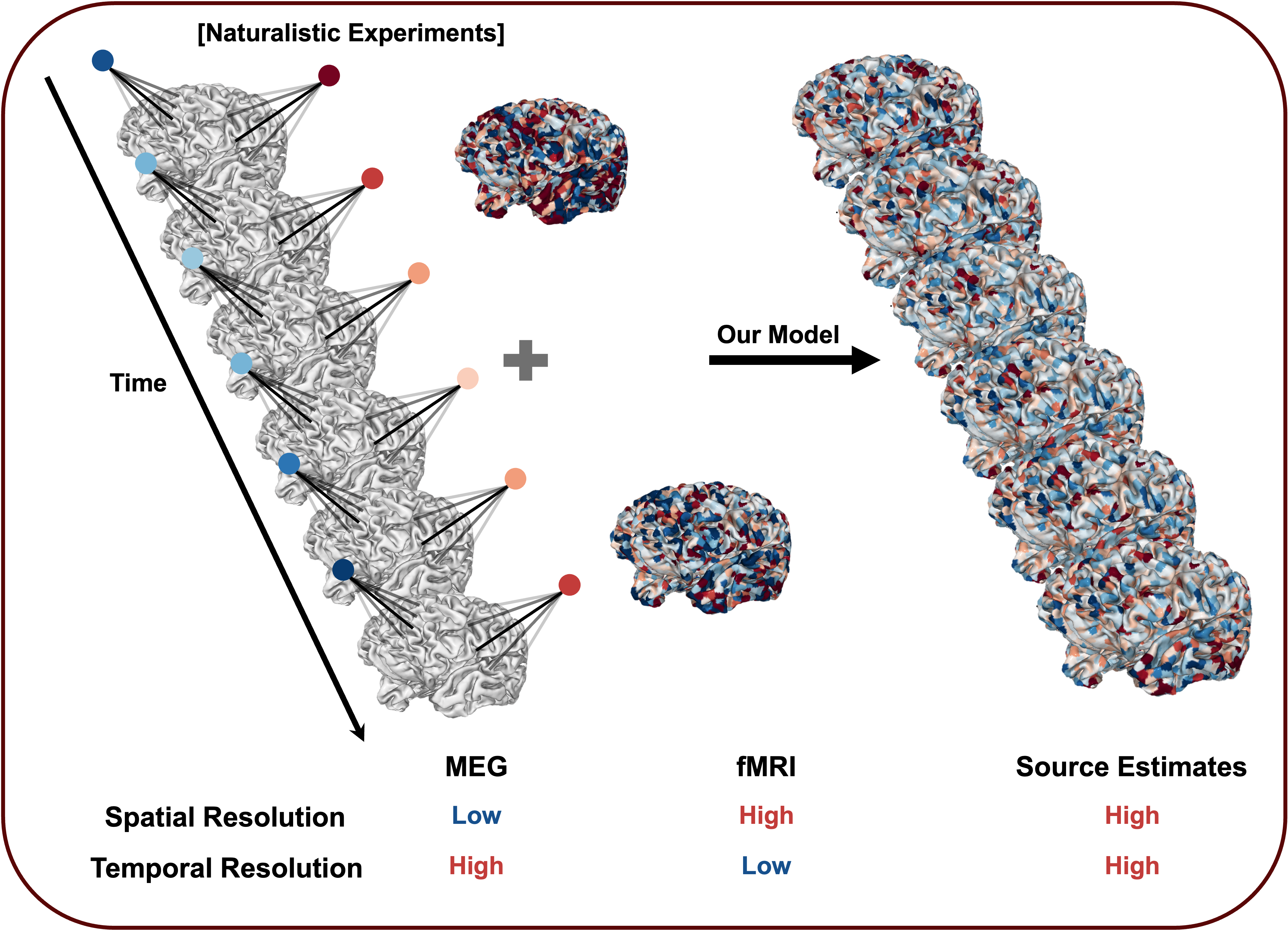 Our model predicts MEG better than the common standard of single-modality encoding models, and it also yields source estimates with higher spatial and temporal fidelity than classic minimum-norm solutions in simulation experiments. We validated the estimated latent sources by showing its strong generalizability across unseen subjects and modalities. Estimated activity in our source space predict electrocorticography (ECoG) better than an ECoG-trained encoding model in an entirely new dataset. By integrating the power of large naturalistic experiments, MEG, fMRI, and encoding models, we propose a practical route towards millisecond-and-millimeter brain mapping.