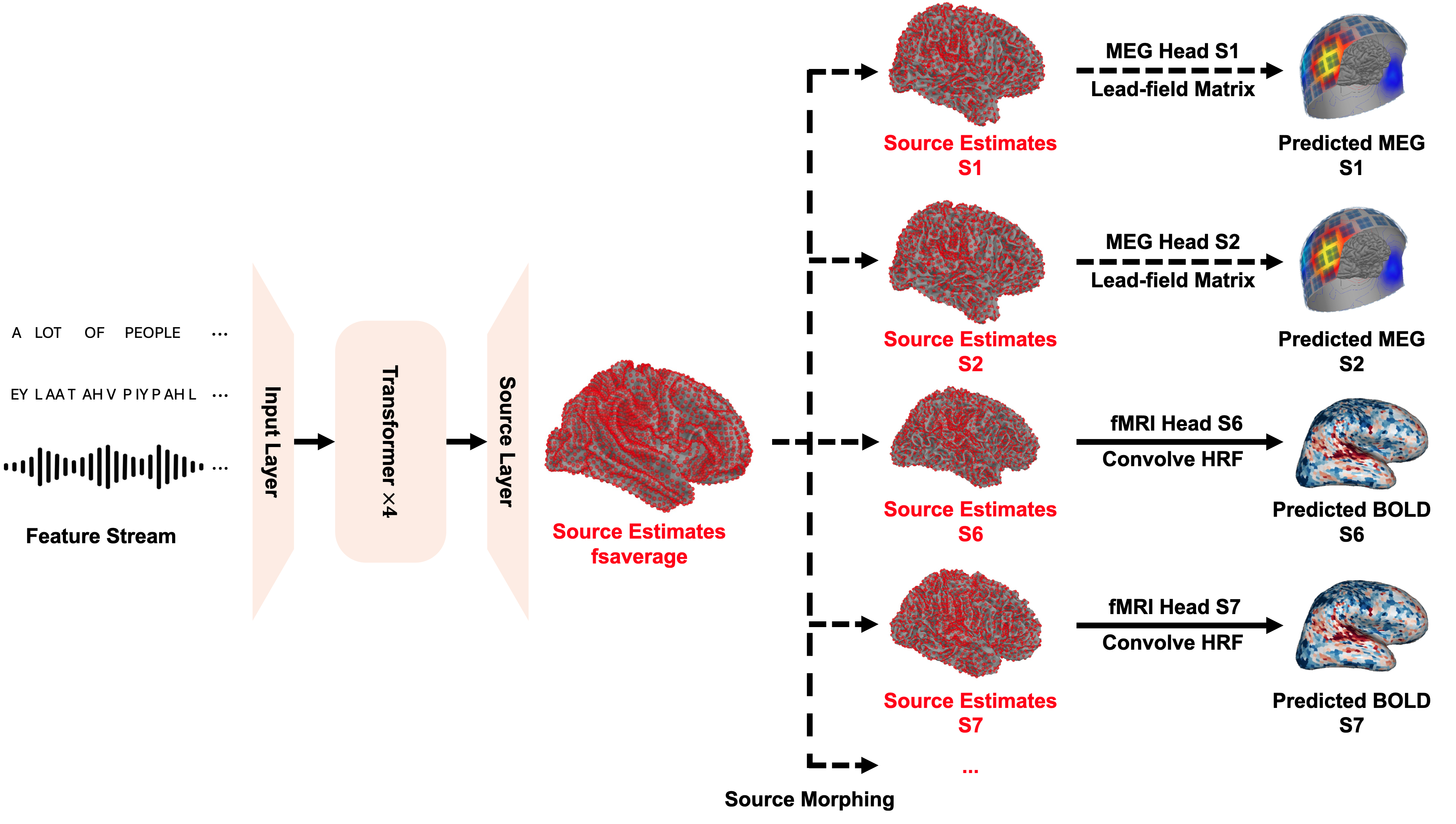 We collected whole-head MEG when subjects listened passively to more than seven hours of narrative stories, using the same stimuli in an open fMRI dataset (LeBel et al., 2023). We developed a transformer-based encoding model that combines the MEG and fMRI from these two naturalistic speech comprehension experiments to estimate latent cortical source responses with high spatiotemporal resolution. Our model is trained to predict MEG and fMRI from multiple subjects simultaneously, with a latent layer that represents our estimates of reconstructed cortical sources.