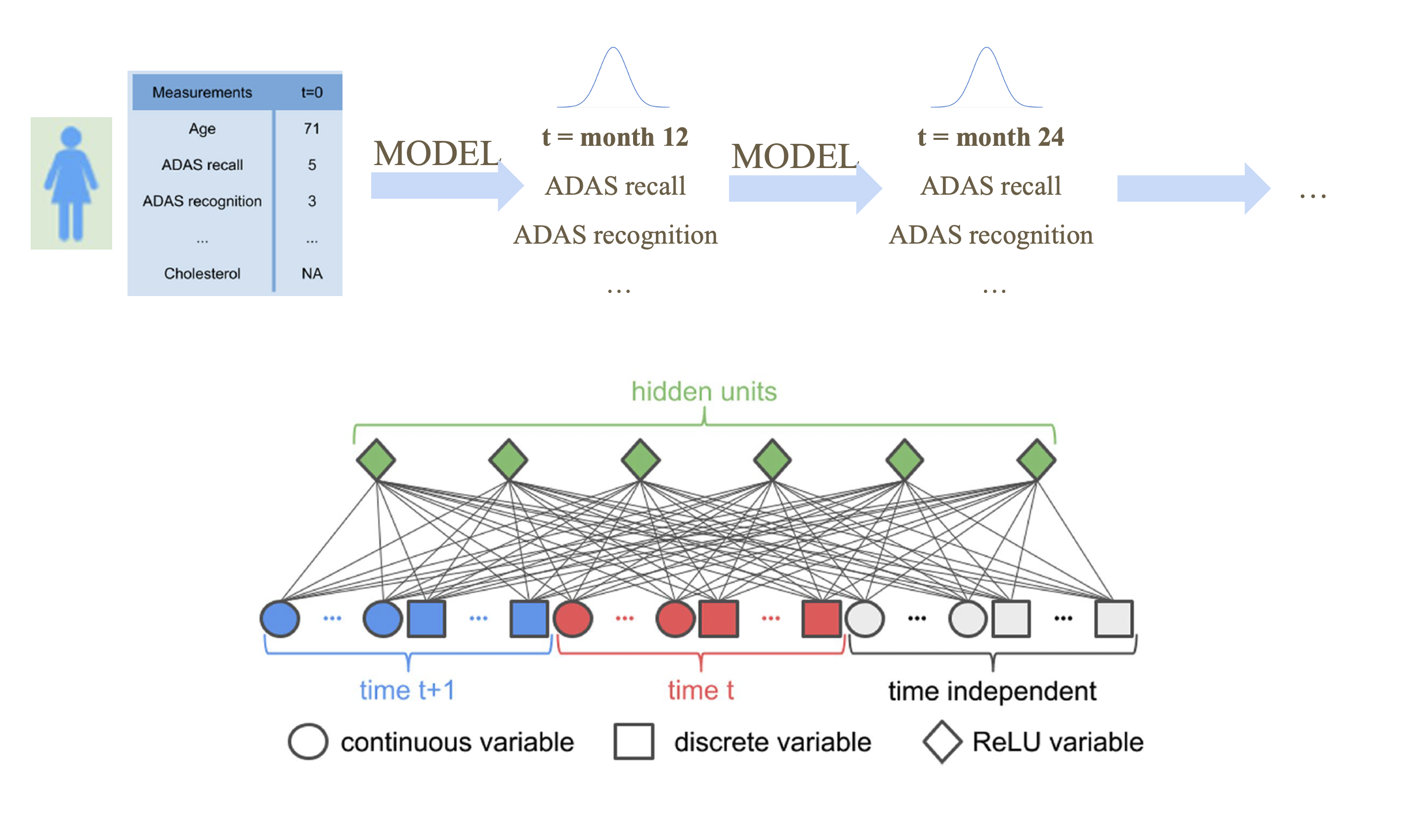 We developed digital twins for Alzheimer’s Disease patients, i.e., predictions of outcomes for individual patients describing their likely progression in the future under standard-of-care given their baseline characteristics. We exploited the Alzheimer’s Disease Neuroimaging Initiative (ADNI) database and extracted features including psychological assessments, biospecimen, genetics, and PET imaging. We trained a Conditional Restricted Boltzmann Machine (CRBM) to predict the distribution of a patient’s features at future time points given his/her features at baseline. We showed that our model effectively captures the distribution of variables and performs comparably to linear regression and random forest for time points near the baseline.